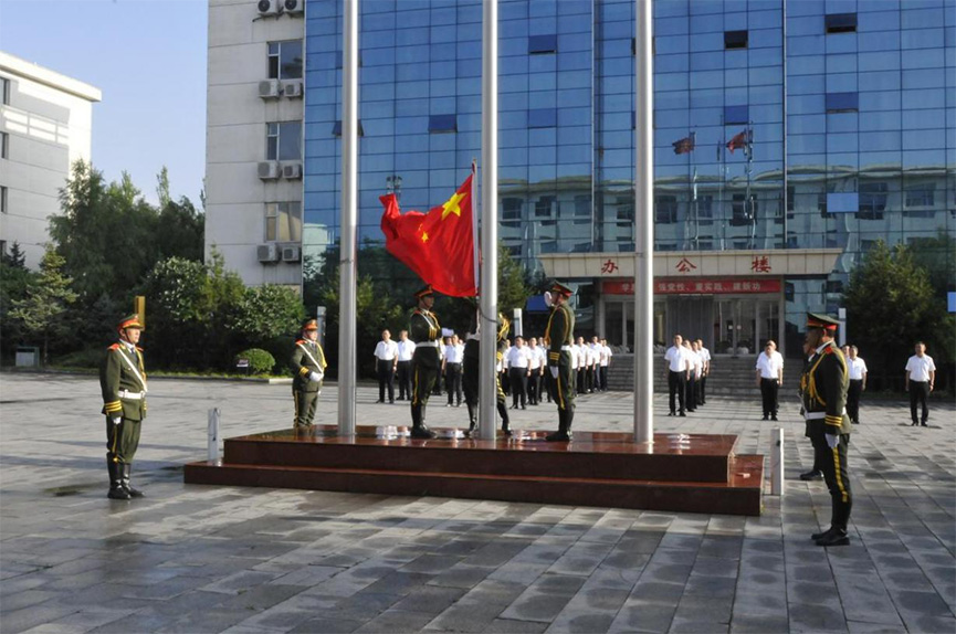 儀式中,升旗手手擎國旗,在國旗護衛隊的護衛下,邁著穩健步伐登上升旗臺。在雄壯的國歌聲中,鮮艷的五星紅旗在全體人員注目下冉冉升起,迎風飄揚。