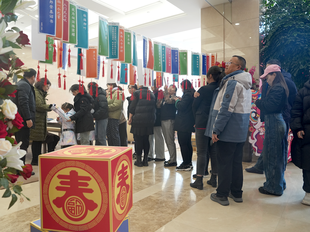 在辦公樓大廳一側,懸掛著五彩斑斕的一串串燈謎,吸引著眾多干部員工駐足競猜,有的眉頭緊鎖,陷入深思;有的豁然開朗,喜形于色;有的興奮地與同伴分享猜中的喜悅,構成了一幅歡樂祥和的猜謎畫卷。